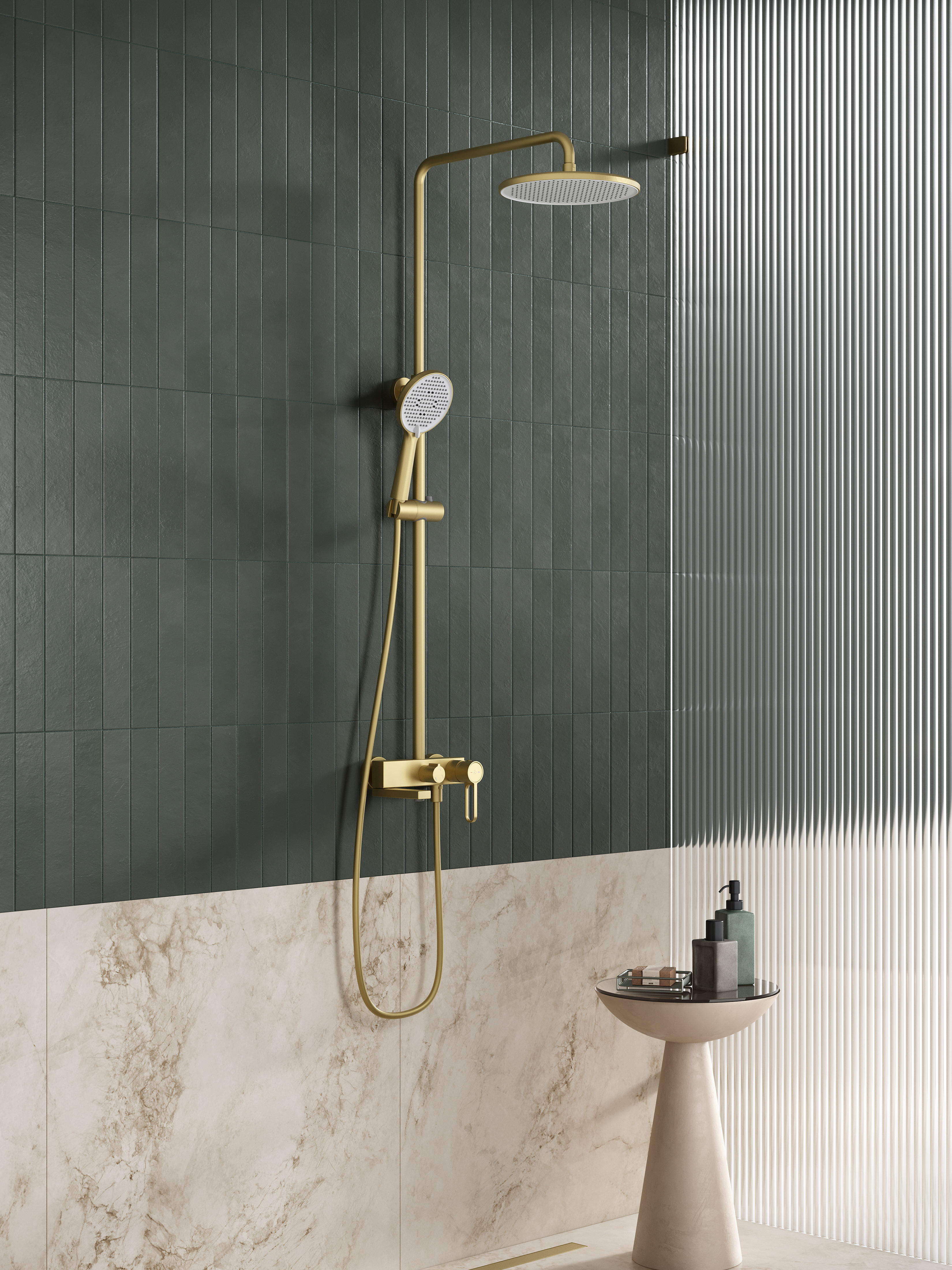Coloana de dus in finisaj auriu periat se potriveste perfect atat cu amenajarile deschise, cat si cu cele inchise la culoare, evidentiind caracterul elegant si modern al baii. Este alegerea ideala pentru persoanele care cauta o coloana de dus cu design deosebit si baterie pentru cada, care imbina estetica cu functionalitatea.